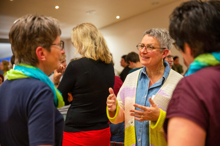 Referentin Irène Wüest (links) vertieft im Smalltalk mit einer Teilnehmerin.Text: Esther Peter-Dossenbach, Bilder: Tanja Metz
