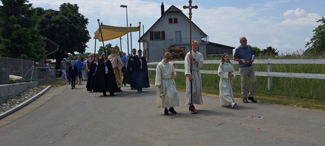 An die heilige Messe an Fronleichnam schliesst sich die Prozession an. Dabei wird die getragene Monstranz in einem Festzug mit Gebet, Gesang und Musikgesellschaften begleitet.