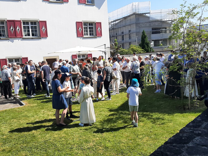 Das Zentrum der Prozession bildeten die den Baldachin tragenden Kirchenräte.Die «Harmonie» begleitete auch den Apéro musikalisch. Man spürte die Zusammengehörigkeit und Bedeutung von diesem Fest auch jetzt, durch frohe Begegnungen bei Gross und Klein, junge und junggebliebene Anwesende.Maria Hermann