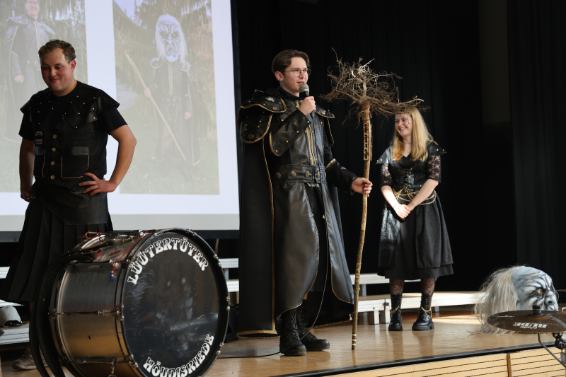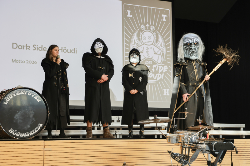 Neu war auch das Outfit, mit dem die Lüütertüter auftraten. Traditionellerweise wird dieses mit einer PowerPoint-Präsentation und Modenschau vorgestellt. «Heute waren einige Vereinsmitglieder froh, endlich wieder einmal ein Kleid anziehen zu dürfen, das noch ganz ist – ‹ohni Schränz› und mit allen Knöpfen», meinte Präsident Wolf schmunzelnd. Unter Applaus betrat daraufhin eine Delegation des Motto-Grüpplis die Bühne – mitsamt Grind und in Vollmontur. Heuer treiben die Lüütertüter unter dem Motto «Dark Side of Höudi» ihren Schabernack. Entsprechend dunkel ist das Gewand gehalten: Ein schwarzer Mantel mit glänzend gemustertem Stoff gilt als Herzstück des Gewandes. Goldene Borten, Nieten und Knöpfe setzen edle Akzente. Dass man dieses Jahr düster unterwegs ist, kommentierte Wolf augenzwinkernd: «Wie ihr wisst, schauen wir jeweils gut, dass die Fasnacht für uns trotzdem genug bunt wird.»