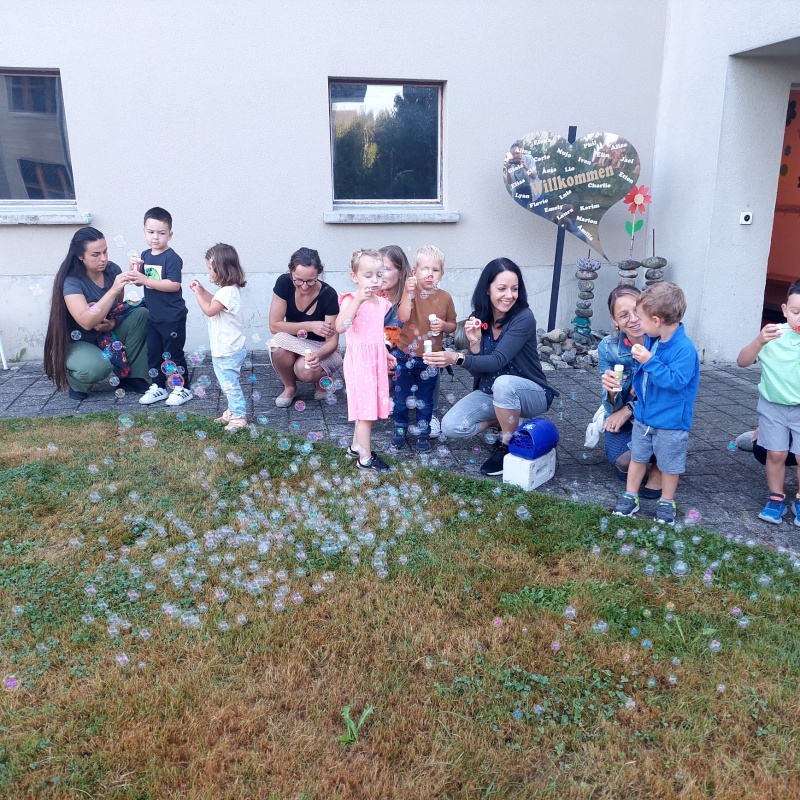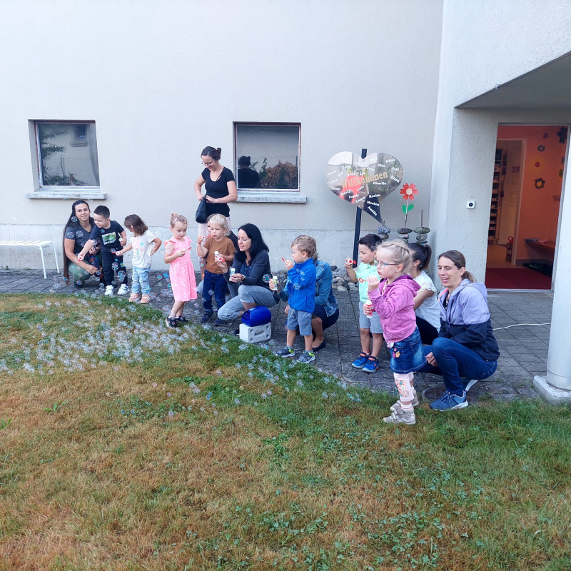 Dann war es so weit, die Spielgruppenwoche begann. Die Kinder der vier Raumspielgruppen trafen sich morgens vor dem Spielgruppenraum. Nachdem alle Kinder ein Fläschchen Seifenblasen in den Händen hielten, zählten sie gemeinsam auf drei und das neue Spielgruppenjahr wurde mit vielen regenbogenfarbenen Seifenblasen begrüsst.