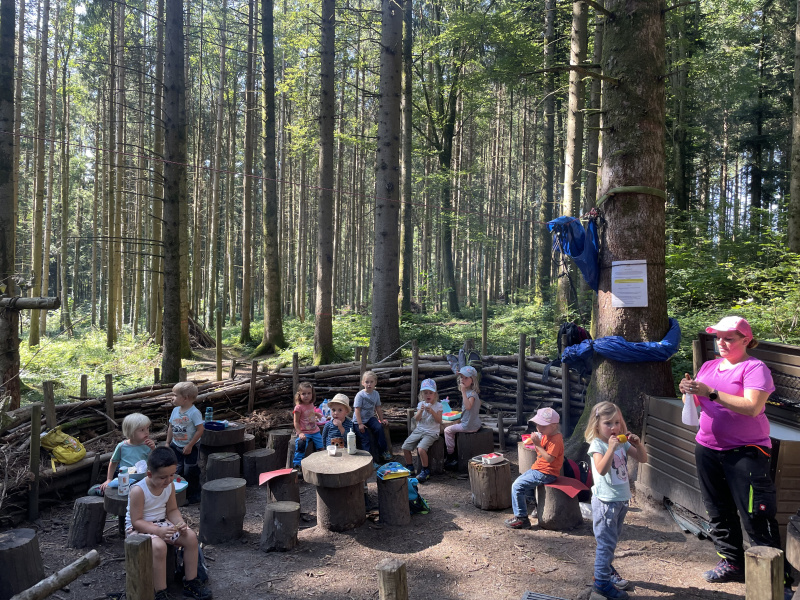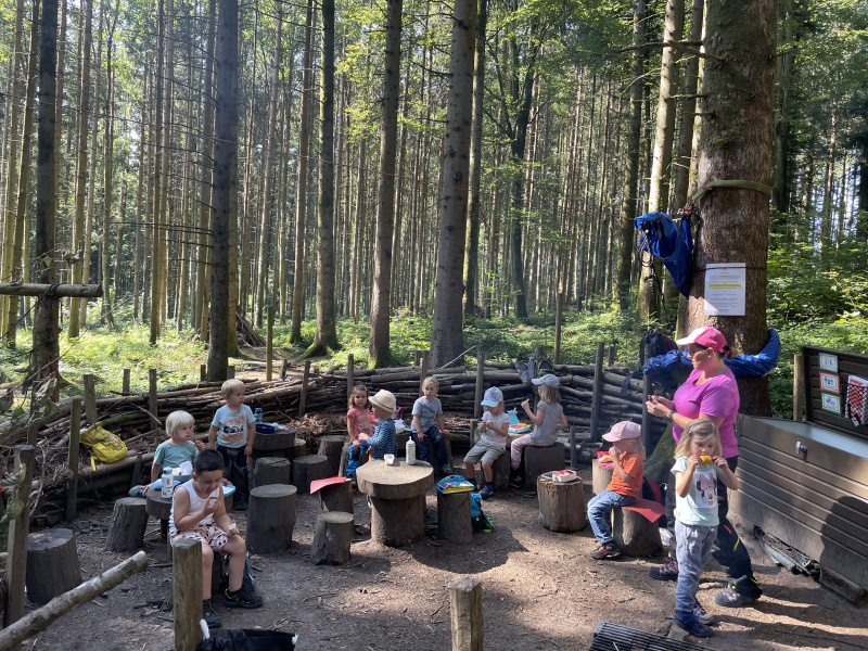 Über dem Feuer wurden die mitgebrachten Leckereien gegrillt und alle genossen gemeinsam das Zvieri auf dem Waldsofa (ein aus Altholz gestalteter Bereich mit Holzsitzen und Feuerstelle). Dann hiess es schon wieder aufräumen und zusammenpacken. Viele Kinder hätten am liebsten noch weitergespielt oder wären über den Waldspielgruppenplatz gestreift. Doch die drei Stunden Spielgruppenzeit waren schon fast vorbei. Bepackt mit ihren Rucksäcken und vielen neuen Eindrücken marschierten die Kinder mit den Leiterinnen zurück zum Parkplatz, wo die Eltern ihre müden, aber glücklichen Kinder in Empfang nahmen.