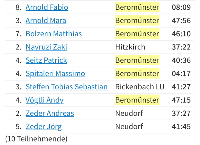 Für die Podestplätze der LR Beromünster sorgten diesmal Andreas Zeder (2.), Zaki Navruzi (2.), Mara Arnold (3). und Tobias Steffen (3.). Coach Andy Vögtli stach bei den Viertplatzierten mit einer sehr starken Zeit heraus. Auch Massimo Spitaleri (4.), Patrick Seitz (4.), Jörg Zeder (5.), Matthias Bolzern (7.) und Fabio Arnold (8.) brachten starke Leistungen.