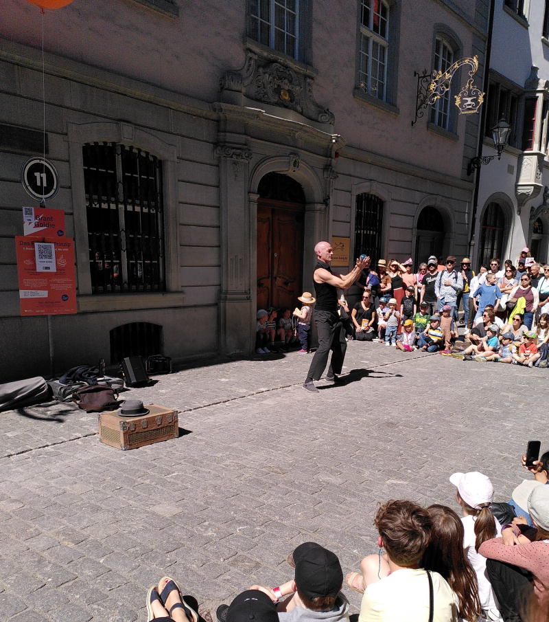 Ich war 19, als mich die Faszination des Jonglierens packte und mit 25 begann ich öffentlich aufzutreten. Mit 28 trat ich dann auf der Strasse auf. Heute ist das meine bevorzugte Bühne.