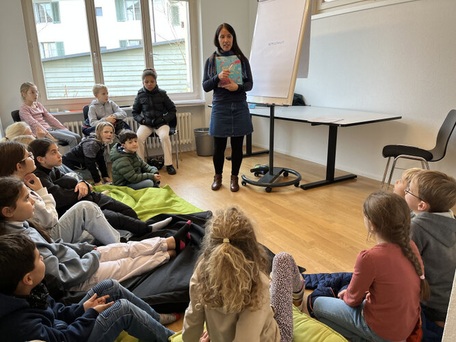 Am Mittwoch, 19. November, fanden in der Bibliothek gleich zwei unterhaltsame Anlässe statt. Eine grosse Schar von rund 70 Kindern belebte die Bibliothek und lauschte entweder der Autorin vom Sachbuch «Biome der Meere» oder unserer Leseanimatorin, die das Bilderbuch «Die Ente blinzelt nicht» mitgebracht hatte.