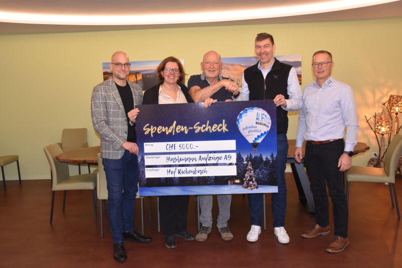 Diesen Spendencheck überreichte die Firma Haslimann Aufzüge AG zum Jahresende 2022 der Institution Hof Rickenbach, die sich für Demenzbetroffene einsetzt.