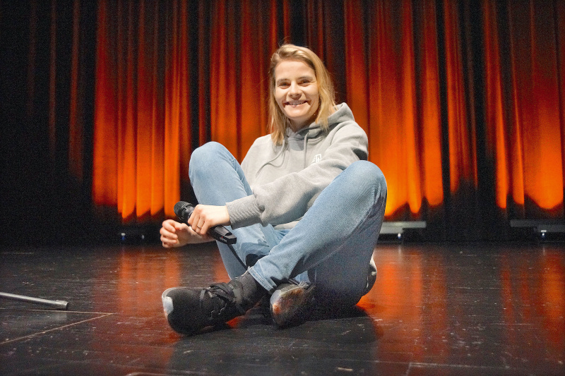 Die gebürtige US-Amerikanerin wuchs in Dielsdorf auf und lebt und arbeitet heute in Zürich und Köln. Sie ist bekannt als «böseste Frau der Schweiz», braucht keinen roten Faden, zieht lieber selber die Fäden… Sie ist unglaublich schlagfertig, und es ist beeindruckend, wie sie beiläufig Geschichten erzählt, die immer mehr auswuchern und dann doch irgendwie zum Ausgangspunkt zurückkommen. Unübertroffen ist sie in der Interaktion mit dem Publikum. Wie locker die Komikerin spontane Absurditäten bringt und immer wieder darauf Bezug nimmt, sollte als Lehrvideo in Komikerschulen für die Nachwelt festgehalten werden. Dies bewies sie schon zum Einstieg in Reinach – wer auf den vordersten Plätzen sitzt oder sonstwie auffällt, lebt gefährlich. Dafür machte sie für die Fotografen im Saal schon zu Beginn einige schöne Posen, «damit das schon mal erledigt ist»…