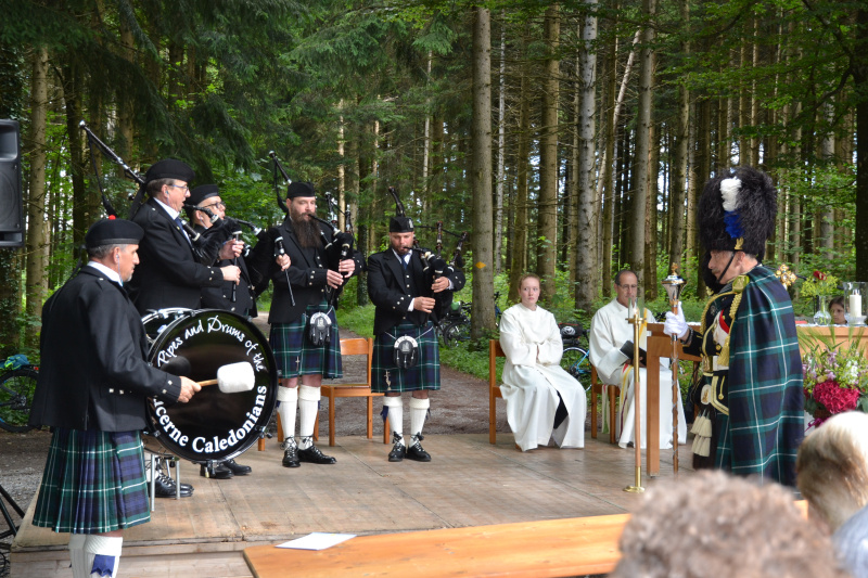 Sechs Männer, in Kilts (Schottenröcke) gekleidet und Bagpipe (Sackpfeife, «Dudelsack») spielend, schritten durch den Mittelgang auf die Altarbühne. Unter der Leitung von Roland Essig, Drum Major (Tambourmajor), nahmen sie mit schottisch- traditionellen Rhythmen und Melodien aktiv an der Feier teil. Sogar den Vögeln des Waldes schienen diese Klänge zu gefallen. Die militärisch klaren Kommandos des Majors zeigten die stramme Disziplin, die zu dieser Musik gehört.