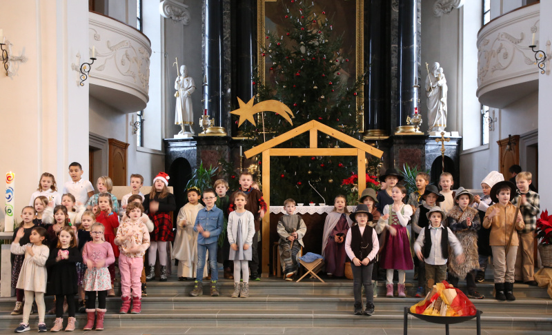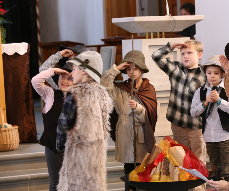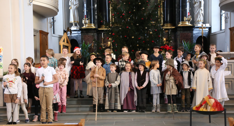 Traditionsgemäss fragte die für die 2. Klassen verantwortliche Katechetin Béa Bucher die Kinder im Herbst, welche Rolle sie im Krippenspiel spielen wollten. Aus den Schulkindern wurden somit am Weihnachtsabend Hirtinnen und Hirten, Wirtinnen und Wirte, Dorfbewohner, Maria und Josef und Engel.