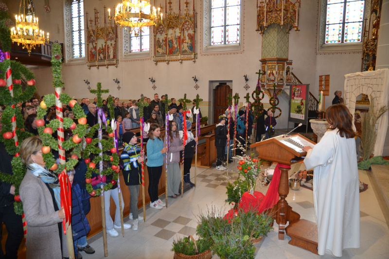 Die sieben prächtigen Palmbäume, von Hildisrieder Familien hergestellt, bildeten zusammen mit den zehn Palmkreuz-Stangen der Fünftklässler, unter Anleitung von Hanni und Robi Duss, die spezielle Palmsonntagstimmung. Zusammen mit den vielen, vom Sakristanen- und Pfarreiteam sorgfältig arrangierten Palmbüschel und den farbigen Tüchern säumten diese den Mittelgang der Kirche; der König Jesus hätte unmittelbar in die zahlreiche Festgemeinschaft einziehen können.