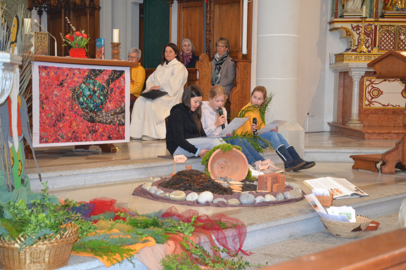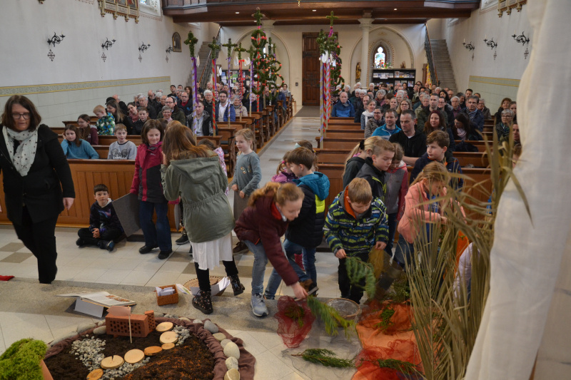 Der Einzug Jesu in Jerusalem, der Palmsonntag, wurde in Hildisrieden am 24. März als Familiengottesdienst gefeiert. Die Schülerinnen und Schüler der 5. Klasse feierten mit der Katechetin Regula Soom und der Seelsorgerin Simone Häfliger aktiv mit.