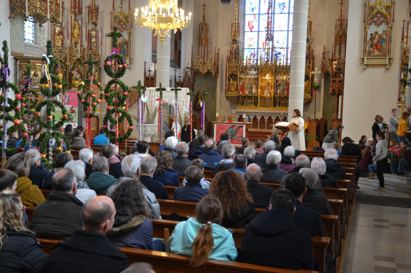 Nachdem Simone Häfliger das Segensgebet über die Palmen gesprochen und die Palmen mit Weihwasser besprengt und mit Weihrauch berührt hatte, durften während der Ansprache der Liturgin, die Kinder, die wollten, einen Palmstrauss mit farbigen Bändern verzieren. Die Schüler:innen der 5. Klasse halfen den Kindern beim Anbinden eines Ausmalbildes an den Palmstrauss.