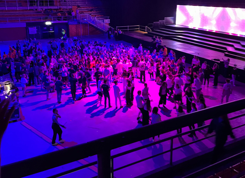 Am Abend konnten wir endlich die grosse Festival Halle sehen, weil dort das Offene Singen stattfand. Danach haben wir zu Abend gegessen – es gab Reis mit einem Stück (vegetarischem) Fleisch – und dann sind wir mit dem Zug zu unserer Turnhalle gefahren, wo wir zusammen mit einem anderen Chor übernachtet haben.