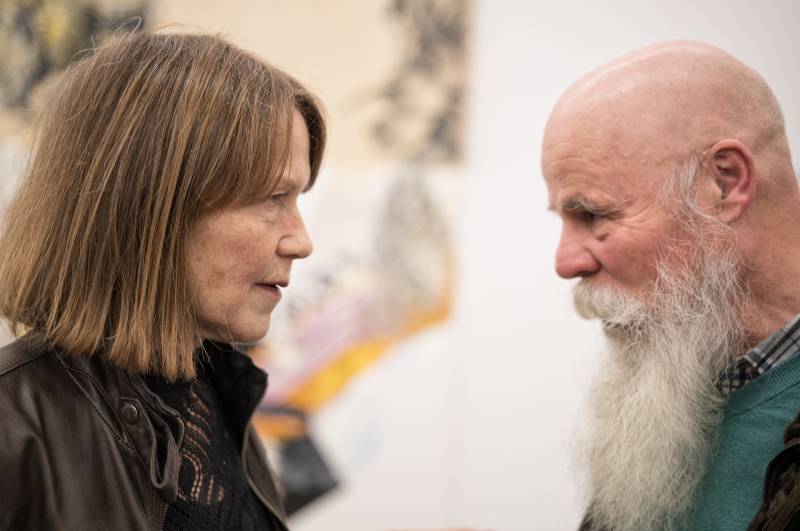 Zur Eröffnung Anfang Februar sind auch Daniel Bucher und Ignaz Suter aus Beromünster gereist, die das Schaffen von Pia Fries schon seit Jahrzehnten verfolgen. «Die Bilder von Pia Fries mit ihren Farben und Schichtungen sind einfach faszinierend!», sagt Daniel Bucher, der auch mit der Künstlerin verwandt ist. «Sie sind kraftvoll und einnehmend. Ich bin schlicht begeistert. Er habe den Abend im Kunsthaus Baselland mit den vielen Besucher:innen genossen, erzählt er. «Es war ein Abschalten vom Alltag und ein Eintauchen in eine andere Umgebung. Ein Besuch ist absolut empfehlenswert!» Auch Ignaz Suter ist beeindruckt, auch von Pia Fries als Mensch: «Sie strahlt eine extreme Ruhe aus, eine Ausgeglichenheit und Überlegtheit, und sie ist sehr offen!»