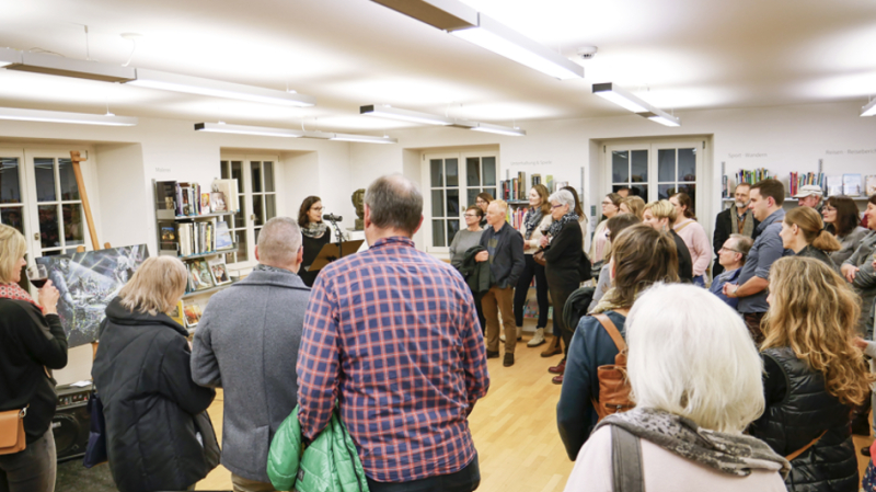 In ihrer Begrüssungsrede, umgeben von einer grossen Gästeschar, richtete die Künstlerin herzliche Dankesworte an alle, die sie begleiten und unterstützen – feinfühlig musikalisch untermalt vom Duo «AndrewsFries».