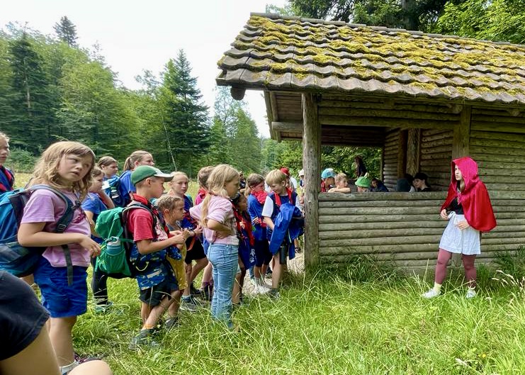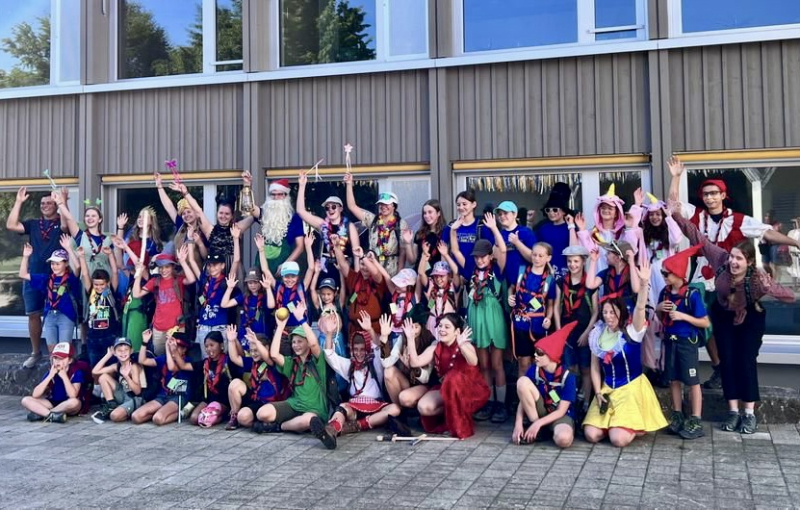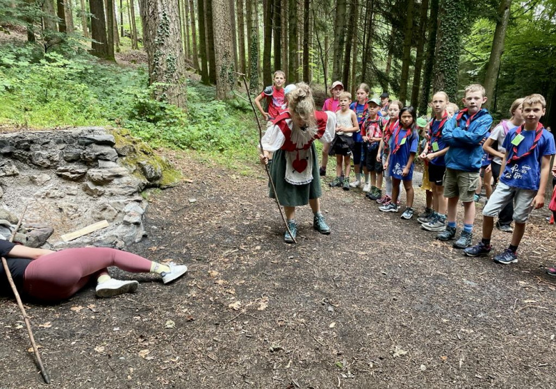 Dort angekommen, wurde die Wölflischar von Papa Schlumpf begrüsst. Dieser war jedoch ebenfalls aus dem Häuschen, denn seine Schlümpfe waren verschwunden. Er meinte, sie sollen zur Grossmutter von Rotkäppchen. Diese hätte ein Rezept für ein Zaubermittel, um die Schlümpfe wieder zurückzuzaubern. Also machten sie sich auf den Weg. Im Wald fanden sie jedoch immer wieder Haarsträhnen am Boden. Sie folgten diesen und fanden so Rapunzel. Sie bot an, sich als Rotkäppchen zu verkleiden und den bösen Wolf abzulenken, damit sie Grossmutter besuchen konnten. Bei der Grossmutter angekommen ging das Durcheinander jedoch weiter. Denn bei der Grossmutter fanden sie den toten Wolf. Sie meinte, sie hätte diesen gerade beseitigt, da er sie angegriffen hatte. Und tatsächlich konnte sie ihnen das Rezept geben, welches Papa Schlumpf erwähnte. Damit konnten sie wieder Schlümpfe zaubern. Diese fanden den Heimweg jedoch nicht alleine, weshalb sie Dumbo um Hilfe baten. Nach einem entspannten Nachmittag flog er diese danach nach Hause. Am nächsten Tag wurden alle dann vom Froschkönig geweckt. Dieser war sehr traurig, denn er hatte seine Krone verloren. Er meinte, sie sei ihm ins Meer gefallen, weshalb sich alle auf den Weg zum Meer (Badi) machten. Und tatsächlich fanden sie beim Meer Arielle die Meerjungfrau, welche die Krone vom Froschkönig trug. Arielle meinte, dass sie ihnen die Krone nur geben würde, wenn ihr der Froschkönig dafür Beine zaubern würde. Der Froschkönig willigte ein und bekam seine Krone wieder. Den Rest des Nachmittags genossen alle mit baden. Am darauffolgenden Tag besuchte sie Arielle, sie war immer noch etwas wackelig unterwegs und meinte deshalb, dass sie Merlin finden sollten, er könne die Märchenwelt wieder in Ordnung zaubern. Deshalb haben sie sich mit einem Leiterlispiel den Weg zu Merlin erkämpft und ihn gefunden. Als Merlin dann die Märliwelt wieder in Ordnung zauberte, feierten alle zusammen diesen Abschluss natürlich mit einem leckeren Apéro und anschliessendem Spieleabend. Die Pfadi Rain konnte eine abenteuerliche, spassige und aufregende Woche geniessen. Wir freuen uns bereits wieder aufs nächste Lager!