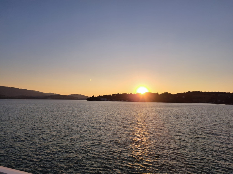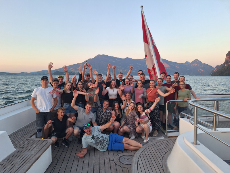 Nach dem alle genügend gegessen hatten, lockte die wunderschöne Abendstimmung die ganze Gruppe auf das Deck des Schiffes. So konnte der strahlende Sonnenuntergang bestaunt werden. Mit tollen Gesprächen und einem angenehmen Fahrtwind genossen die Mitglieder die letzten Minuten, bevor es wieder zurück ging. Wer bis dahin noch nicht genug hatte, liess den Abend feierlich in ausklingen. Für einige Mitglieder endete der Abend nach der Schifffahrt und andere zog es noch weiter in die Stadt Luzern an das «Stadtfäscht», und wiederum andere zog es noch ans Grümpelturnier in Neudorf.
