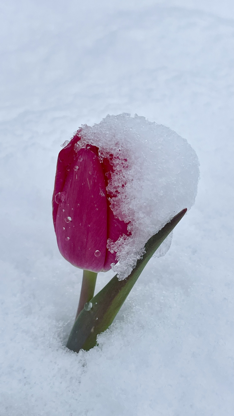 Leserbild der Woche: Kontrastreiche Tulpe im späten Aprilschnee