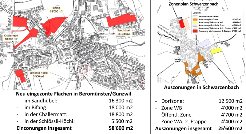 In Beromünster werden insgesamt 33 000 Quadratmeter mehr eingezont als in Schwarzenbach ausgezont. Auch wenn noch ausgezonte Kleinflächen in anderen Ortsteilen mit einbezogen werden, bleiben insgesamt mehr als 30 000 m2 zusätzliche Bauzonen. Wie ist das möglich?