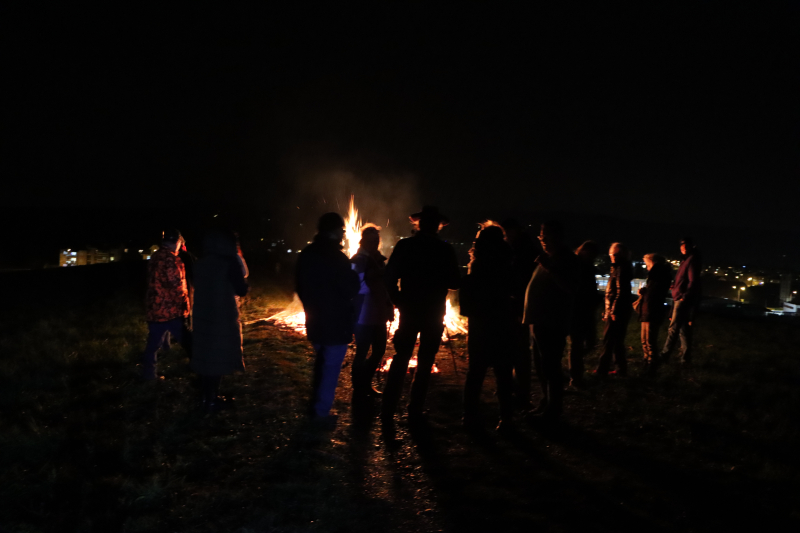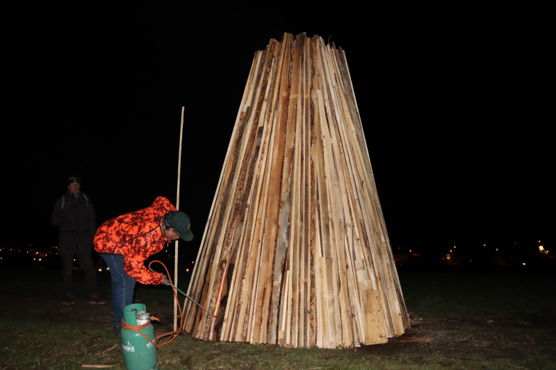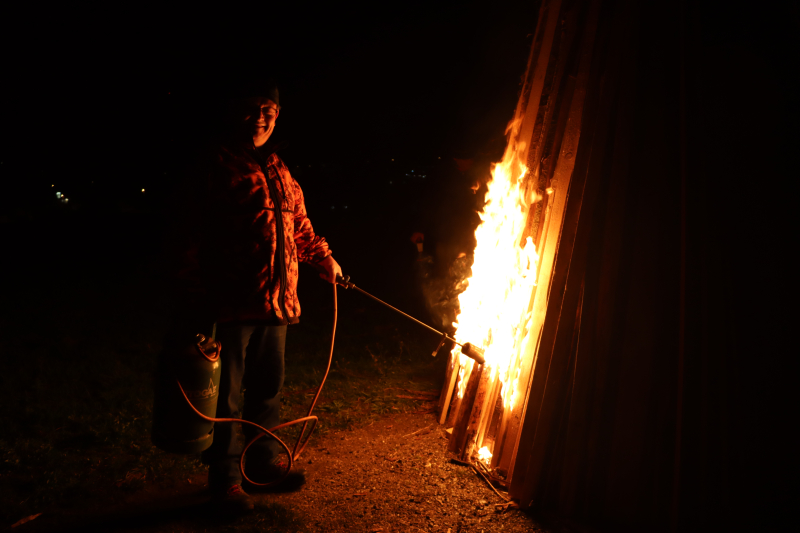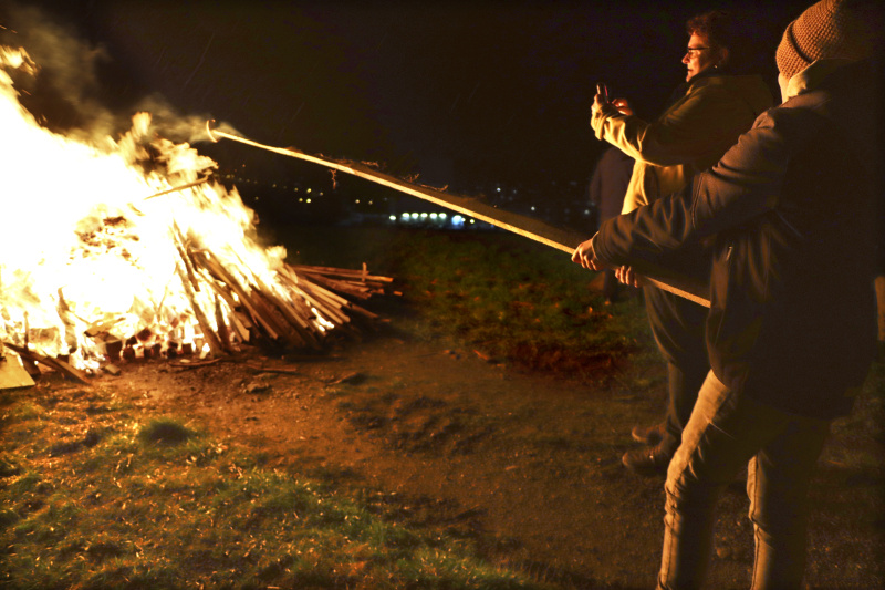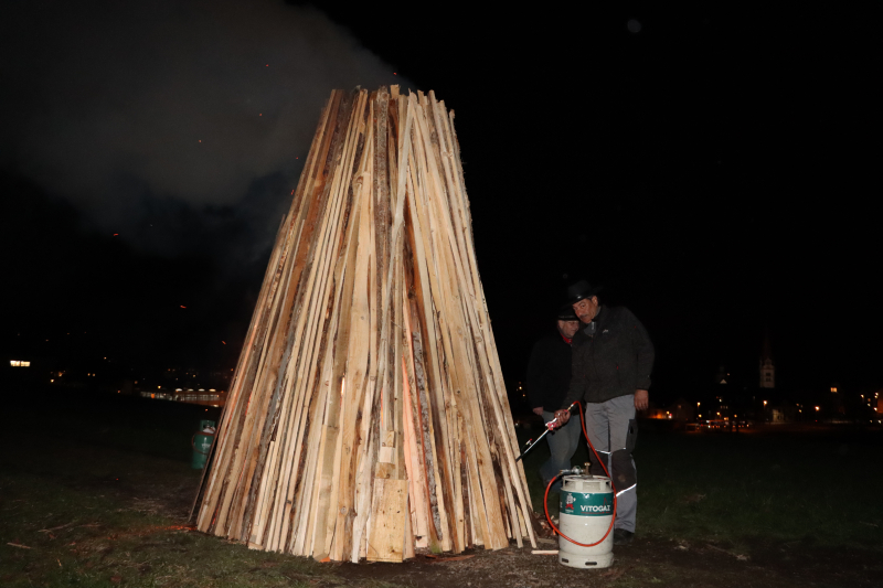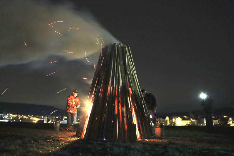 Es braucht schon etwas «Pfuus», damit die Flammen aufflackern können, denn das Holz ist etwas nass. «Ohne Gasbrenner wärs schwierig», meinen Bär und Ritschi und zündeln freudig in den Stapel, der nun doch allmählich zu ziehen beginnt. Nieselregen fällt, der Westwind frischt auf. Ein gutes Dutzend Leute stehen gutgelaunt auf dem Hügel der Schanz bei Beromünster. Urtümlich, was hier abgeht, es entspricht einer uralten Tradition, immer exakt am 12. März hier dieses Feuer zu entzünden.