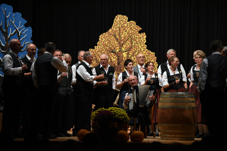 Conferencier Christof Bühler vor dem Herbstbaum in Position.Conferencier Bühler stellte die Dirigentin, Trudy Ineichen, vor – «das esch die met der Tracht» – und befasste sich dann mit dem Motto «Johreszyte». Ein Modell, das inzwischen eher einem anderen Platz gemacht habe, welches man sonst eigentlich nur aus den Ferien kenne: Trockenheit und Monsun statt Frühling, Sommer, Herbst und Winter. Das Chörli liess den Herbst aber mit «Herbschtzyt am Bärg»…