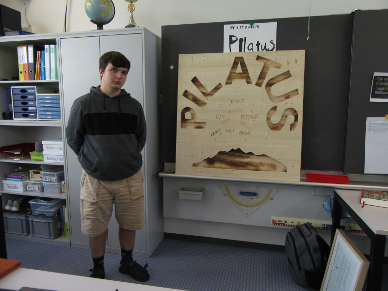 Nils hat ein Projekt für die Gruppe Pilatus gemacht. Auf einer grossen Holzplatte hat er die Silhouette und Buchstaben des Pilatus ausgesägt. Anschliessend hat er die Namen seiner Gruppenkollegen darauf verewigt. Er arbeitete mehrheitlich selbstständig an diesem Projekt und brauchte viel Geduld sowie Durchhaltewillen. Als er sein Kunstwerk am Ende der Woche den anderen vorstellen konnte, waren alle begeistert.