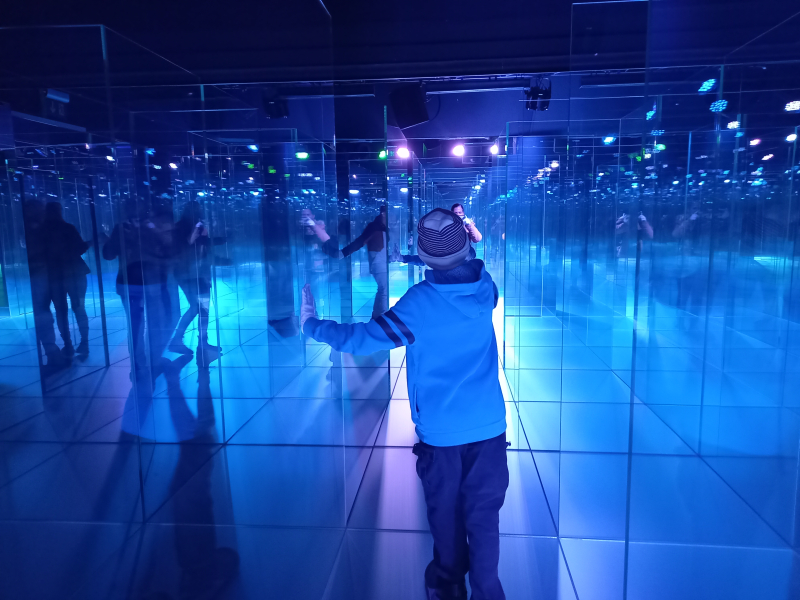 Am Ende der Führung kamen sie in einem Raum raus, in dem sie den Glasern bei der Arbeit zuschauen konnten – definitiv das Highlight des Tages! Nachdem sie die bewundernswerte Arbeit der Glaser begutachtet hatten, konnte sich die Klasse in Zweiergruppen einen Weg durch ein Glaslabyrinth ertasten. Im Nebengebäude gab es zahlreiche spannende Experimente, welche alle auch etwas mit Glas zu tun hatten. Nach den faszinierenden Experimenten machte sich in der Bauchgegend bei einigen ein Knurren breit. Zu Mittag ass die Klasse eine Pizza im «Glasi-Kafi». Beim Rückweg zum Bahnhof kamen sie noch an einem Spielplatz mit einer riesigen Kugelbahn vorbei. An diesem anziehenden Ort konnte noch ein schönes Gruppenfoto gemacht werden. Da die Titlis-Gruppe noch ein wenig Zeit hatte, lief sie gleich einen Bahnhof weiter.