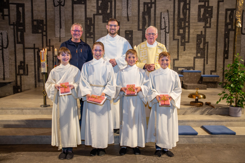 Um dies allen Anwesenden näher zu bringen, zeigte Bruno Oegerli ein paar Bilder mit der Frage, ob man sich bedienen lasse oder diene. Seine Predigt beendete er mit der spürbaren Freude, dass es immer wieder Kinder gibt, die für Gott, für die Kirche und die konkreten Aufgaben, – in diesem Fall Ministrieren – interessiert sind. Dieser Dienst ist nicht so populär wie etwa Unihockey oder Turnen. Vielleicht bekommen die Ministrantinnen und Ministranten noch das eine oder andere nicht so schöne Wort deswegen zu hören, oder sie werden ausgelacht. Vielleicht müssen sie auf einiges verzichten, um den Dienst zu erfüllen. Nichtsdestotrotz haben sie sich angemeldet und wurden in die Minischar aufgenommen. «Das freut uns!», teilt Pfarreiseelsorger Marko Zuparic mit, «Allen neuen Minis wünschen wir viel Freude und schöne Erinnerungen in diesem Dienst. Jenen Ministrantinnen und Ministranten, welche wir verabschiedet haben, danken wir herzlich und wünschen alles Gute auf dem weiteren Lebensweg.»