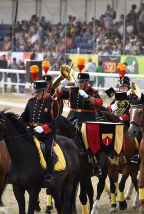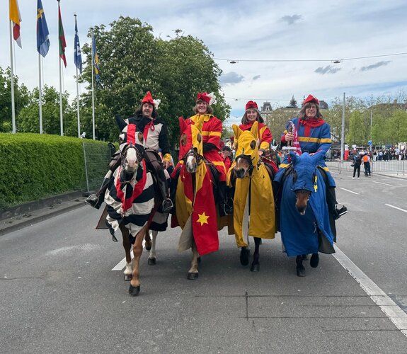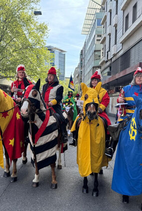 Wie im letzten Jahr durfte auch am diesjährigen Sechseläuten eine Delegation der Reitermusik Gunzwil am traditionellen Umzug in Zürich teilnehmen. Wie gehabt fungierten sie als berittene Fanfarenbläser für die Zunft zu Wiedikon, eine von 26 Zürcher Zünften. Von Gunzwil reisten Hans-Peter Lisibach, Julia Boog, Hubert Küng und Matthias Gisler nach Zürich, ebenso Pius Muff als Organisator und Pferdepfleger.