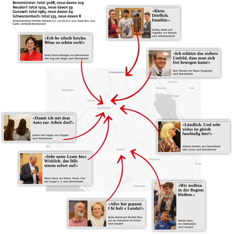 Ein Blick in die Statistik: 17 Personen zogen vergangenes Jahr aus Luzern in die Gemeinde Beromünster, ebenfalls 17 aus Hildisrieden. 15 kamen aus Sursee, 11 aus Menziken und je 10 Personen aus Rickenbach, Hochdorf und Emmenbrücke. Ist es der öV oder die Landluft, die Wohnung oder einfach der Zufall, der den neuen Wohnort bestimmt? Gründe gibt es unzählige, weshalb man etwa aus Malters, Männedorf, Brig oder Basel, Frankreich, Kanada oder China ausgerechnet in der Gemeinde Beromünster landet. Von insgesamt 240 Neuzugezogenen folgten am vergangenen Freitagabend 70 der Einladung zum Begrüssungsanlass des Gemeinderats. Und von diesen verrieten einige der Lokalpresse etwas über ihre Her- und Ankunft sowie ihre Beweggründe.