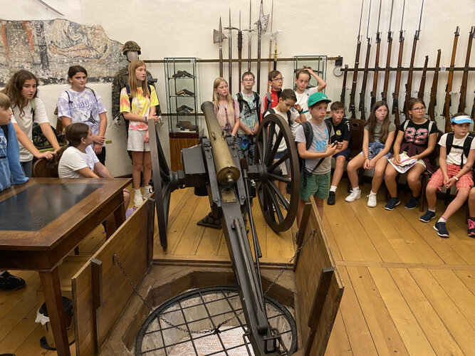 Gewehre und Kanonen im ersten Stock vom Wasserturm.Im ersten Stock konnten die neugierigen Kinderaugen diverse Gewehre, Kanonen und natürlich das berüchtigte Gefängnis bestaunen. Viele spannende und auch gruselige Geschichten wurden uns über Luzern und den Wasserturm erzählt. So mancher wäre gerne noch geblieben und hätte weiteren Geschichten von dieser Zeit zugehört, aber der 2. und 3. Stock wollte ja auch noch entdeckt werden. Hier konnten sich die Kinder an einem grossen Tisch, der Teil für Teil in den Turm gebracht werden musste, etwas…