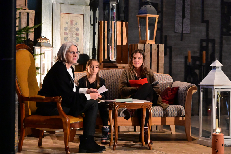 Ein heller Glockenklang signalisierte einen Wechsel. Vorne links war eine Ecke mit Sofa, Möbeln und Laternen eingerichtet. Von da aus moderierte Daniela Dommen zusammen mit ihrer Tochter und Enkelin durch den Anlass. Sie nahm das Publikum mit auf eine sehr persönliche, erzählte Lebensgeschichte, die zur Weihnachtsgeschichte wurde durch Stationen von Verzweiflung und Hoffnung, Trauer und Freude.