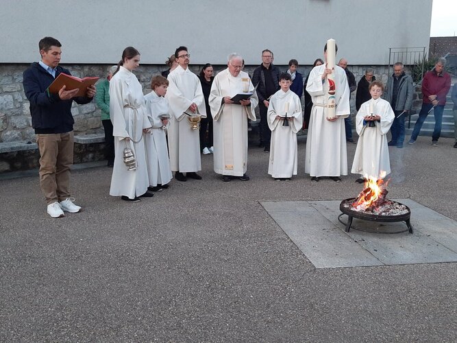 Auf dem Kirchenvorplatz brannte das Osterfeuer, als sich die Gläubigen nach und nach um das Osterfeuer versammelten.