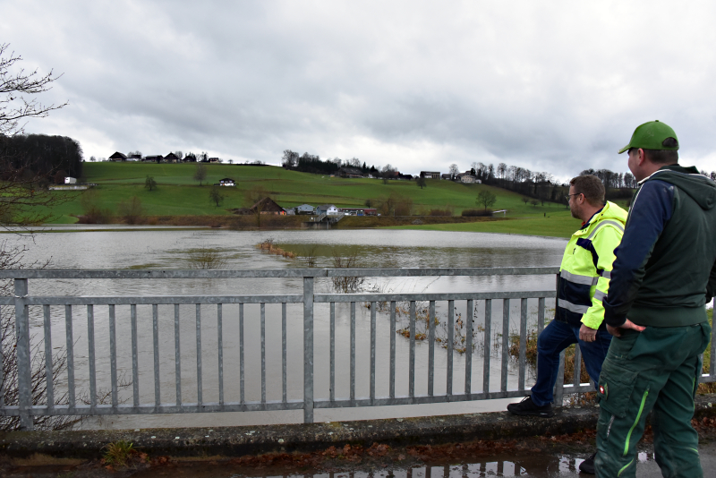 Das Rückhaltebecken Eichmatt waltet zurzeit seines Amtes. Aufgrund des ergiebigen Regens auf den bereits gesättigten Boden ist der Bach zum unübersehbaren See geworden. Noch ist die Situation aber im grünen Bereich.