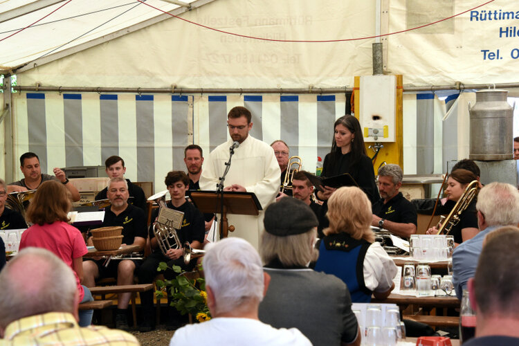 Platzkonzert der Musikgesellschaft Pfeffikon unter Leitung von Herbert Waser.Auf den Gottesdienst folgt ein Platzkonzert der Gastgeber. Bereits schien die Sonne heiss und Präsident Geissbühler sah sich zu einem Aufruf veranlasst: «Tüend gnueg trinke ond natürlich ou gnueg ässe, das esch wechtig – ond natürlich het de ou öise Kassier Freud.» Bald brutzelten Steaks und Bratwürste auf dem Grill und auch im grossen Kessi qualmte es – Suppe und Spatz (es gab 130…