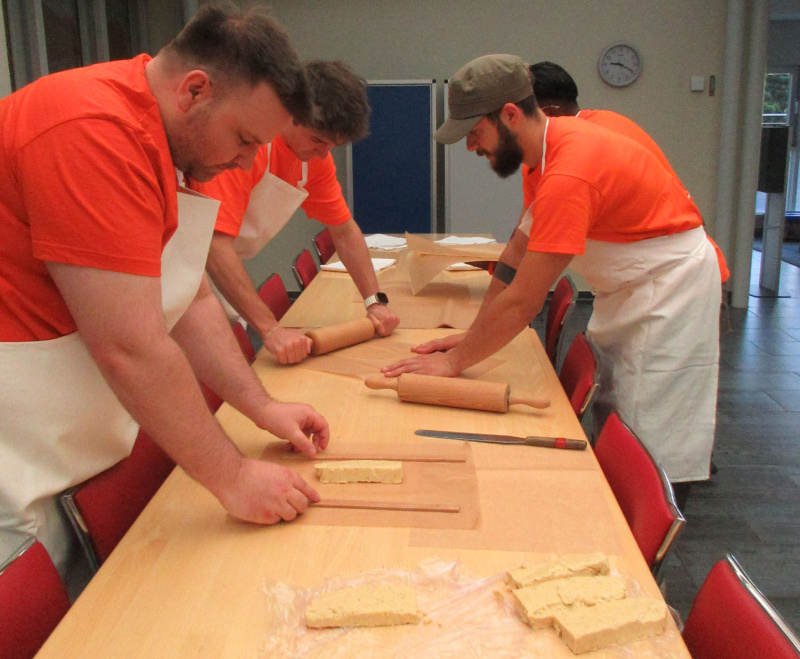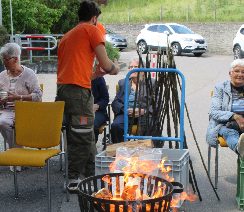 Am Donnerstag konnten die Bewohnenden vormittags zusammen mit den Zivilschützern Haselnuss-Guetzli backen. Der feine Duft der Guetzli war im ganzen Bärgmättli wahrzunehmen. Die leckeren Guetzli wurden zum Kaffee und Dessert verkostet. Anschliessend blieb noch Zeit für Spaziergänge in der Nähe des Pflegewohnheims. Nach dem Mittagessen stellten die Zivilschützer alles für das «Bräteln» bereit. Danach hatten die Senioren die Gelegenheit, den Cervelat über dem offenen Feuer einer Feuerschale zu grillieren. Was gibt es Schöneres als eine feine Wurst am offenen Feuer zu geniessen, wenn endlich wieder mal die Sonne scheint. Anschliessend nahmen sich die Zivilschützer Zeit für einen Jass oder einen kurzen Spaziergang.