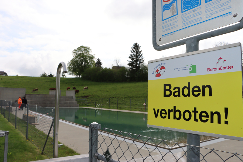 500 Kubikmeter Leitungswasser hat Thomas Stocker, Gemeindearbeiter von Beromünster, letzte Woche ins Becken laufen lassen. Ganze vier Tage dauerte das. Die Einstiegstreppen, Duschen und Abfallbehälter hat er auch schon montiert. Der Überlauf am Poolrand blubbert und plätschert und die Sonne glänzt auf der wabernden Wasseroberfläche, noch heisst es aber: Baden verboten.