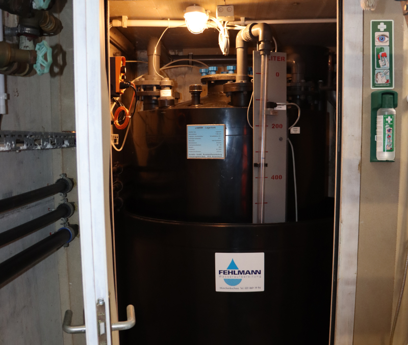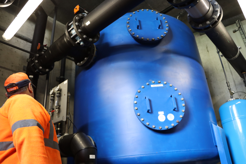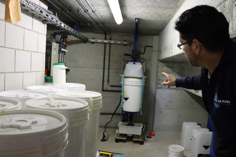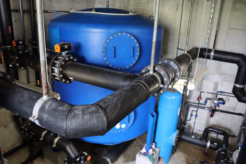 Blickt man ins Innere des Technikraums, fallen sofort zwei riesige, blaue Tanks auf. Sie beinhalten je zwölf Tonnen Quarzsand, der als Filter funktioniert. Das ganze Poolwasser wird laufend durch diese beiden Tanks und weitere Anlagen gepumpt, bis es durch die feinen Strahldüsen auf Fusshöhe wieder zurück in den Pool fliesst.