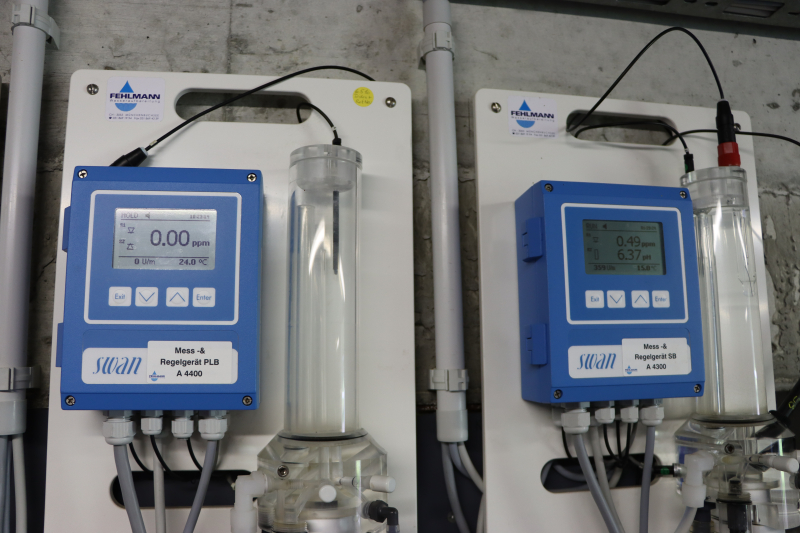 «Die Wasseraufbereitung erfolgt in drei Stufen: Filtration, Neutralisation und Desinfektion», erklärt Adrian Büttikofer von der Firma Fehlmann Wasseraufbereitung. Er ist damit beschäftigt, Geräte wie Düsen, Filter und Pumpen zu montieren, die über den Winter in Revision waren. «Die Quarzsandschicht sorgt für die mechanische Reinigung des Wassers. Mit Säure, meistens Schwefelsäure, wird das Wasser dann in einen sicheren, neutralen Bereich von 6.8 bis 7.6 pH geführt und schliesslich mit Chlor desinfiziert.»