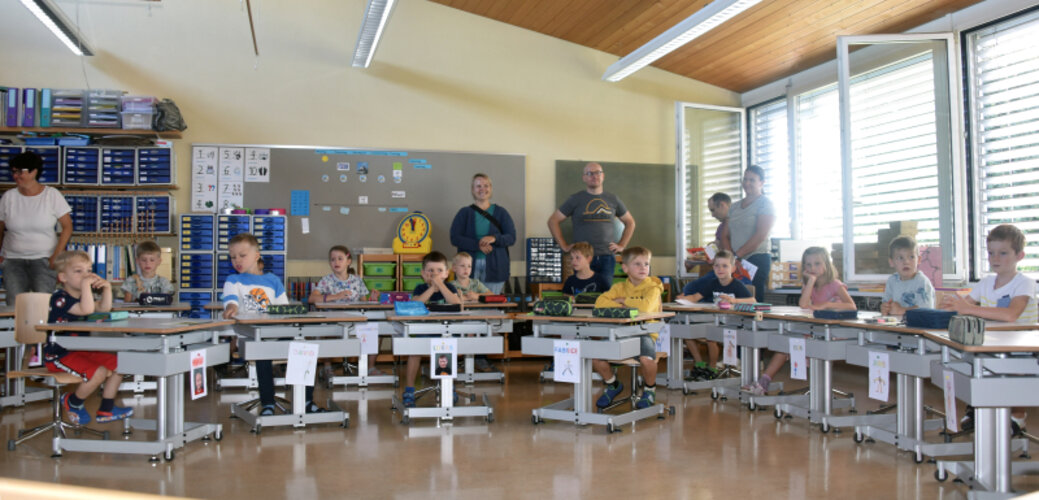 Der Start ins neue Schuljahr folgte in der Turnhalle, die gut zur Schule passt – klein aber fein. Die Stimmung war aufgeräumt, erwartungsfroh, aber auch gespannt. Die Schüler bildeten Grüppchen auf Turnmatten, die Eltern sassen auf Turnbänken. Der Platz reichte nicht ganz aus, Schulleiter Elmar Müller holte also noch ein paar Schwedenkästen aus dem Geräteraum.