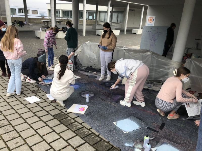 Farbe lag in der Luft: Am Donnerstag wurden fleissig Graffitis kreiert mit der Hilfe von Spraydosen, Schablonen und Skizzen. Ein externer Graffiti Künstler kam dafür extra an die Sekundarschule und zeigte den Lernenden sowie den Lehrpersonen sein Talent und seine dazugehörigen Tricks. Die Jugendlichen durften sich an Leinwänden und alten Schallplatten austoben und diese selbst im urbanen Street Style verschönern.