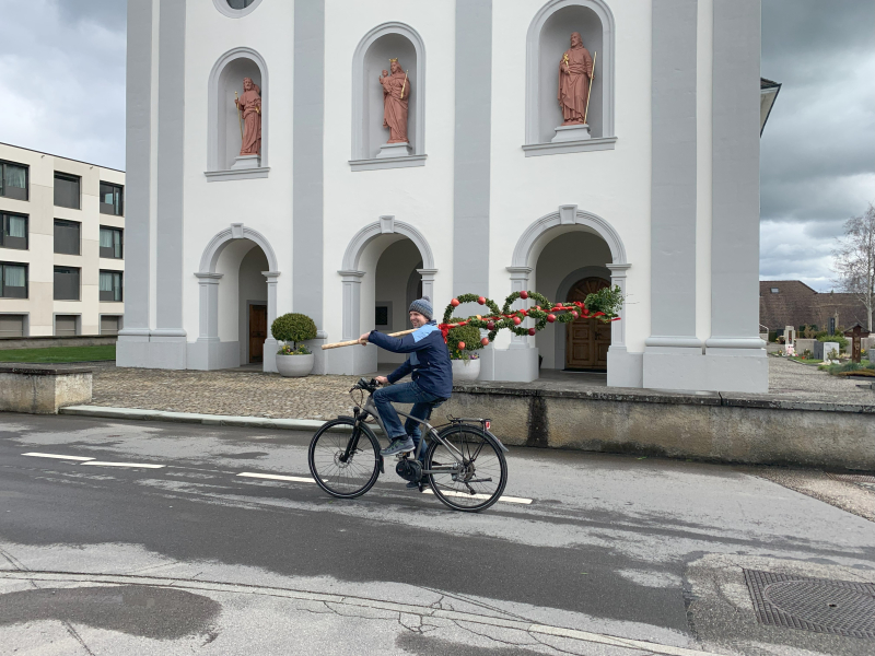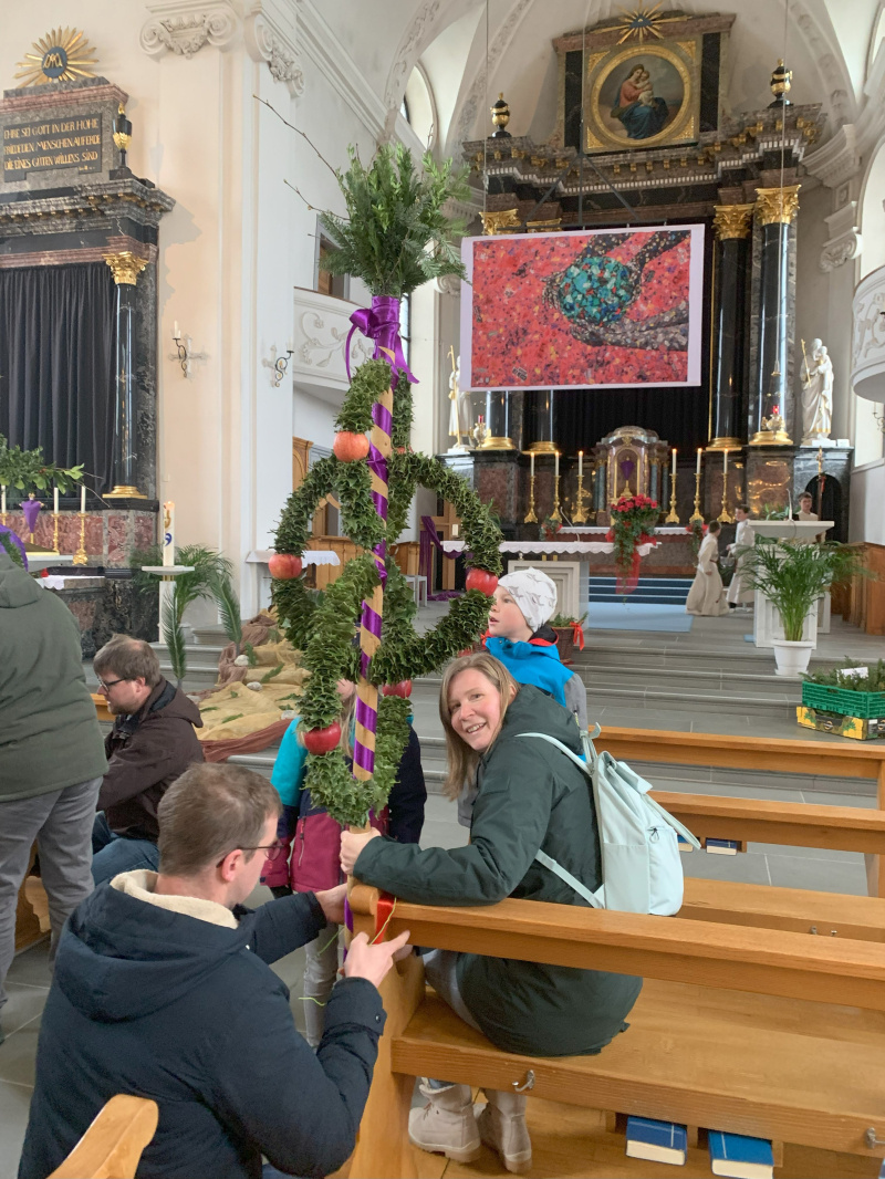 Viele Ministrantinnen und Ministranten haben zusammen mit den drei Sakristaninnen und Eltern sowie Klaus Widmer am Mittwochnachmittag eine riesige Stangenpalme und viele Palmbüschel erstellt. Am Palmsonntag wars dann so weit. Die fast 5 Meter hohe Palme zierte den Kirchenraum beim Seitenaltar mit dem Bild des Hohen Donnerstags. Der Gottesdienst startete wegen des just vor Beginn des Gottesdienstes wieder einsetzenden Regens im Kircheninnern.