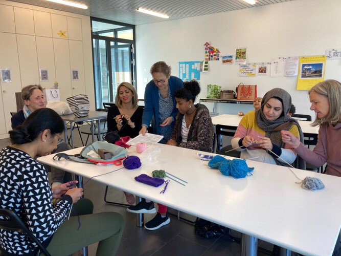 Lismarie Koch schreibt zu ihrem Bild: «Unsere Flüchtlingsfrauen, die zum Plauderkaffee kommen, möchten besser Deutsch sprechen lernen. Darin unterstützen wir sie. Nun kam der Wunsch auf, ausserdem noch stricken zu lernen. Für eine begrenzte Zeit haben wir diesen Wunsch erfüllt. Im Reformierten Kirchenzentrum Gunzwil dürfen wir in einem geräumigen Zimmer mit den Frauen diese für sie fremde Handarbeit kennenlernen. Geplaudert wird natürlich auch. Wir Frauen von der Organisation sind sehr dankbar für die räumliche Möglichkeit.»