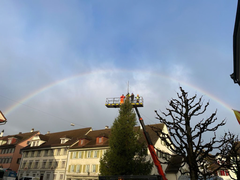 Das erste Glanzlicht erhielt der Christbaum von Beromünster direkt vom Himmel: Exakt zur Montage der Lichterketten spannte sich ein Regenbogen über Fleckenhäuser, Tanne und Hebebühne. Eingefangen wurde das Bild von Denise Dominguez am 24. November 2023.