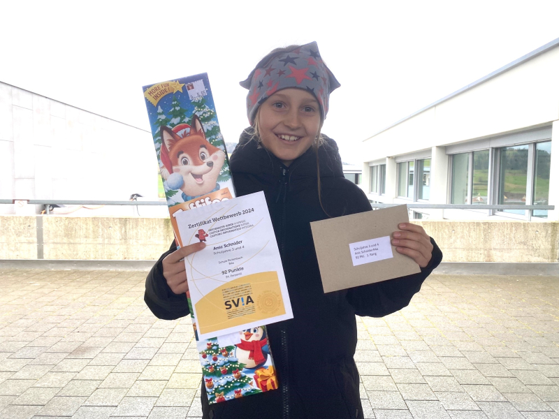 Margarita G., Klasse 6a, holte sich mit dem Punktemaximum schweizweit den Sieg. Die Schulleitung gratuliert herzlich zu dieser herausragenden Leistung.