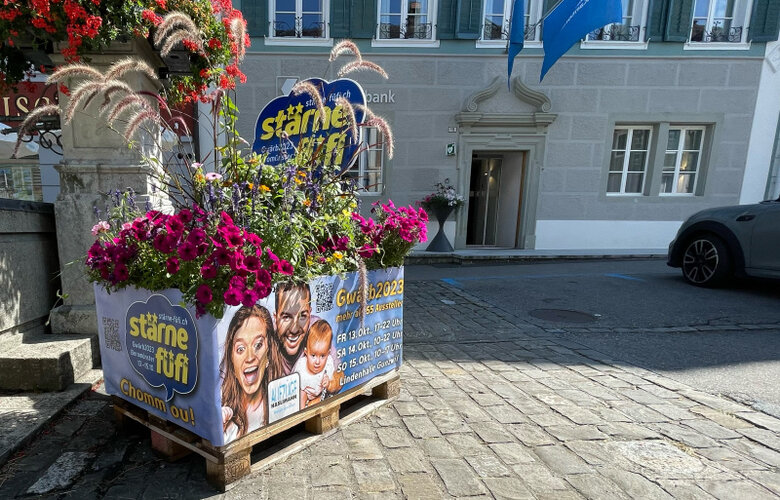 Die Organisatoren der Gwärb 2023, machen mit Blumen auf das grosse Ereignis aufmerksam, welches in 55 Tagen beginnt.