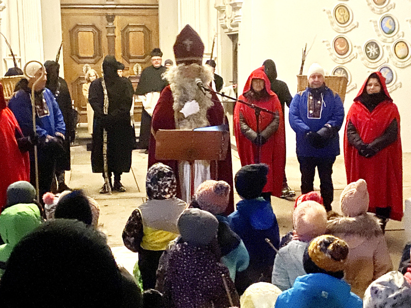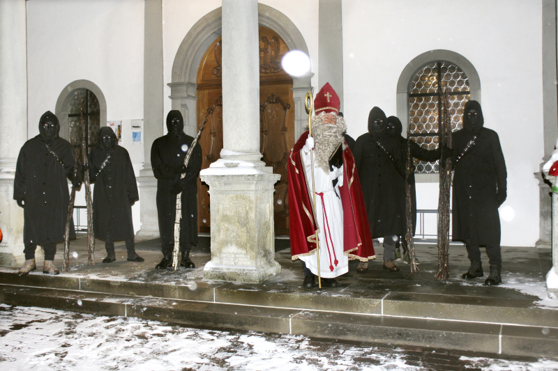 Der Samichlaus zog mit seinem Gefolge und vielen Trychlern und den Geisslechlöpfern, die sich alle minutiös auf den Einsatz vorbereitet und teilweise sehr viele «Original Chrummen» in Reserve dabei hatten, zur Pfarrkirche St. Stephan aus. Es war das erste Mal, dass der Samichlaus mit dem Segen aus dem Gottesdienst auszog. Der Samichlaus trieb sich plötzlich etwas im Chor herum, suchte seine Brille. Die Pastoralraumleiterin Theres Küng sah ihn und war ganz erstaunt. Ein Raunen ging durch die Kirchenbänke. Theres Küng stellte dem Samichlaus dann einige Fragen. Darauf erschien die ganze Mannschaft, darunter acht Schmutzlis, in der Kirche.