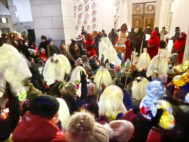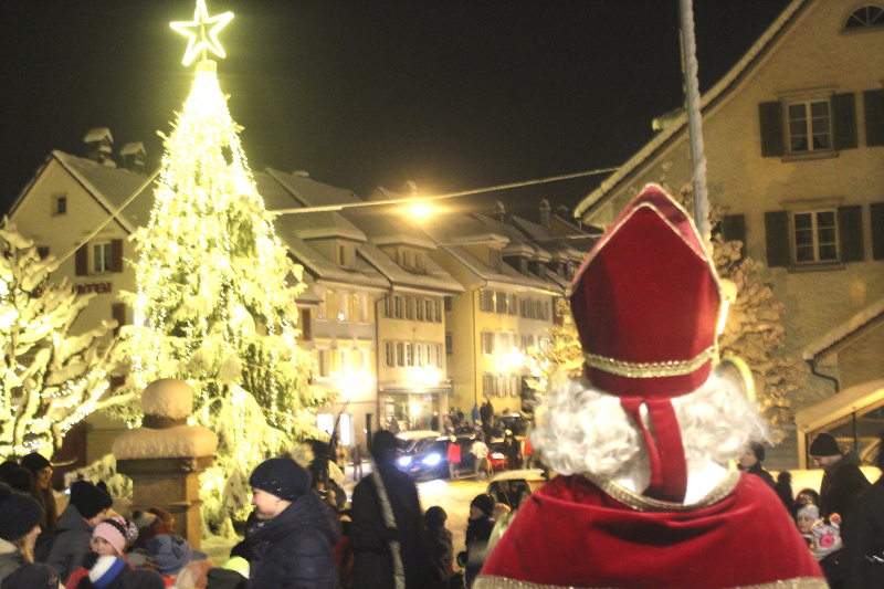 Gemeinsam zog der Samichlaus mit seinem Gefolge durch die Haupttüre aus, wo sie strahlende Kinderaugen empfingen. Der Auszug rauf zum Stift via den Weg des Adventsfunkelns war dann sehr eindrücklich und stimmungsvoll. Vor der Stiftskirche richtete der Samichlaus das Wort an die Kinder. Er wollte, dass sie ganz ruhig werden und seinen Worten lauschen, was auch bald gelang. Er erzählte von seinem Eseli Jack und von seinem Eichhörnli «Pinggi», das ihn bei seinen Recherchen über die Kinder grossartig unterstützt habe. Die Rede war voller kindgerechtem Humor und kam bei allen bestens an. Die Freude der Kinder mitzuerleben war das Glanzlicht an einem an Glanzlichtern reichen Abend. Man merkte, dass viele lebenslange Fans von Chlaus sind, doch auch einige «Team Schmutzli». Und Eseli Jack hat sowieso auch seine Fangemeinde...