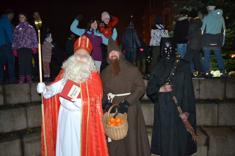 Mit den vielen Schulkindern und den verschiedenen Trychlergruppen zog der Samichlaus in Beromünster von der Pfarrkirche St. Stephan den schön beleuchteten Flecken hinauf. Allen voraus gingen die Geisslechlöpfer. Beim Hirschenplatz verriet der Samichlaus den Kindern, was er so gemacht hatte in seiner langen Pause. Die Kinder strahlten um die Wette und sangen schöne Samichlauslieder. Für das leibliche Wohl sorgten der Gasthof Hirschen und die Enoteca da Ramundo jeweils mit einem Aussenstand. «Samichlous du grosse Maa, darf ech ächt es Säckli ha? Ech be ganz brav gse, s’ganze Johr. Chasch mer gloube, das esch wohr.»