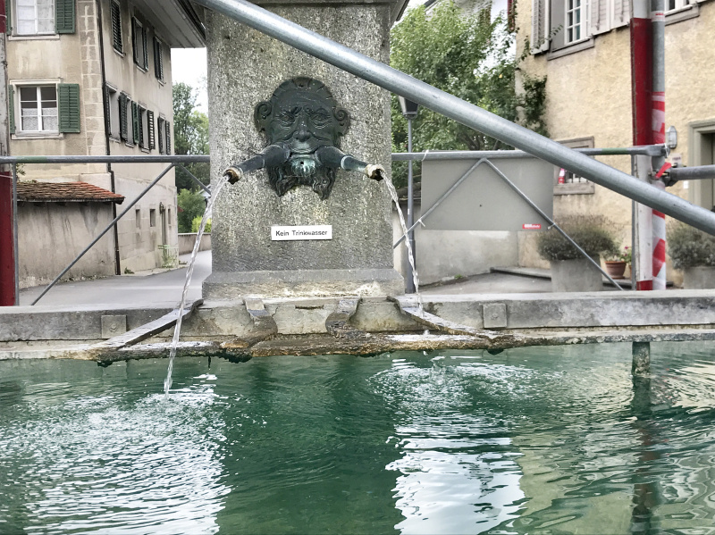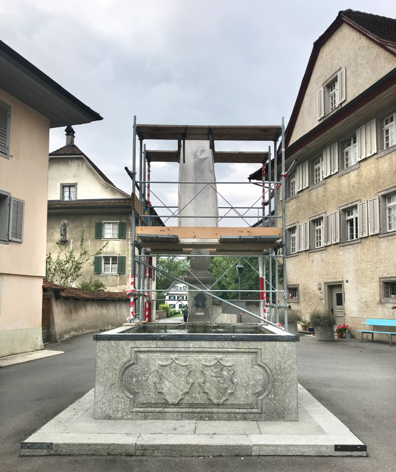 Aufgefallen: Am Badweg in Beromünster ist der Marienbrunnen zwecks Restaurationsarbeiten eingerüstet. Denn auch Göttliches, in Stein gehauen, ist vor Abstürzen nicht ganz gefeit.